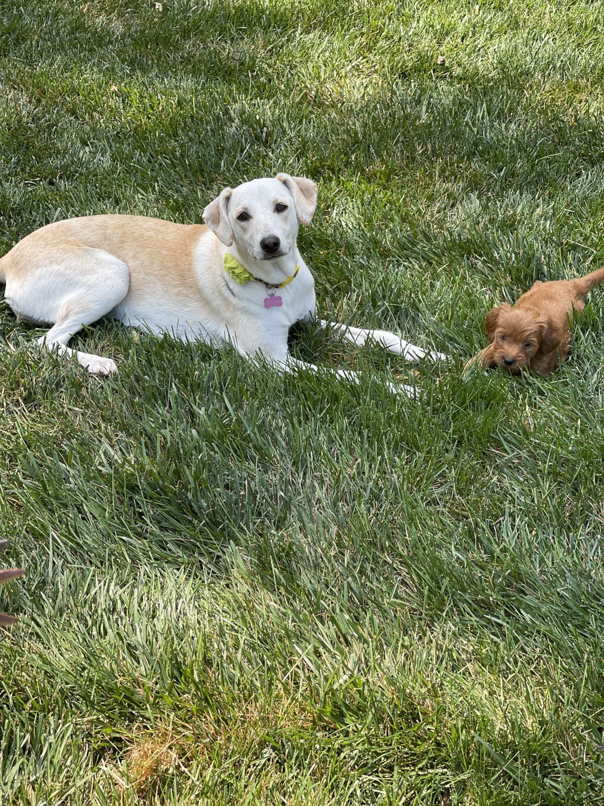 ZuZu and her foster sibling enjoying the sun while she teaches him to be a dog.